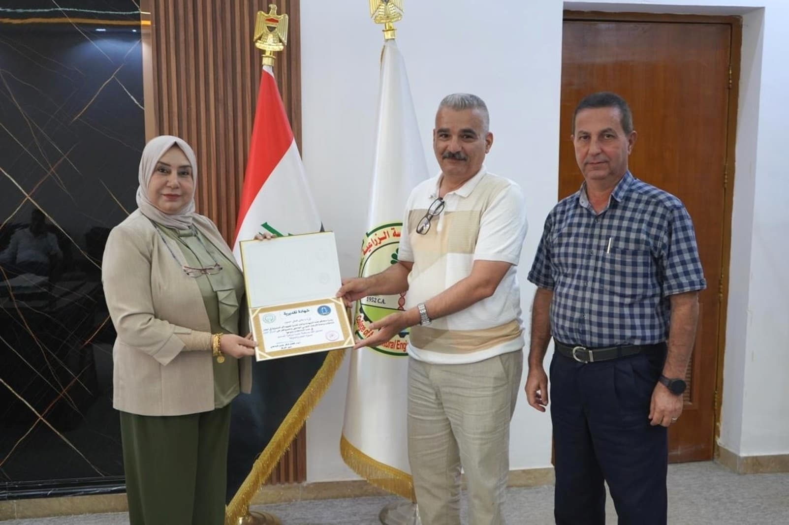 Prof. Dr. Amira Mohammed Saleh, Dean of the College of Agricultural Engineering Sciences at the University of Baghdad, received the Guidance Creativity Shield and a Certificate of Appreciation from Dr. Muthanna Falahi Hamoud, Head of the University Psychological Guidance Unit, in the presence of Prof. Dr. Mohammed Shaker Al-Khashali.
